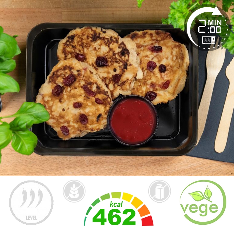 "Składniki: Racuchy 63,6% (mąka pszenna, jabłka 19,4%, MLEKO, cukier, woda, masa JAJOWA pasteryzowana, drożdże, sól, olej rzepakowy), Jabłka 18,3% (jabłka prażone, cukier, kwas cytrynowy) 91,5%, cukier puder 5%, cukier wanilinowy (cukier, wanilina) 3%, cynamon 0,5%), Serek straciatella 18,2% (Serek waniliowy (mleko, śmietanka, cukier, mleko w proszku, aromat, pokruszona laska wanilii, barwnik: karoteny, bakterie fermentacji mlekowej) 90%, czekolada gorzka (miazga kakaowa, cukier, proszek kakaowy o obniżonej zwartości tłuszczu, emulgator: lecytyny /SOJOWE/, naturalny aromat waniliowy) 10%)
